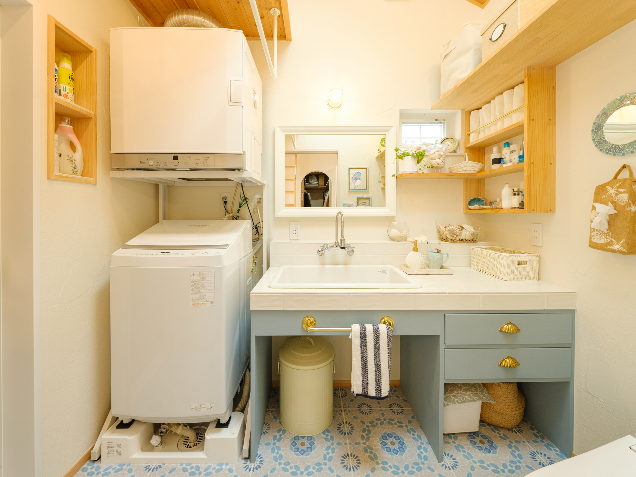 白いタイル天板にエメラルドグリーンに塗装した造作の化粧台がリゾートを思わせる